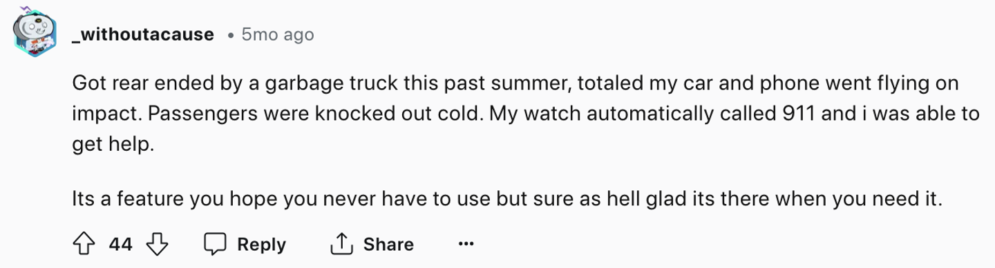 Another recounted: "Got rear-ended by a garbage truck this past summer, totaled my car and phone went flying on impact. Passengers were knocked out cold. My watch automatically called 911 and I was able to get help. It's a feature you hope you never have to use but sure as hell glad it's there when you need it."